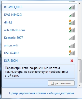 Если при попытке подключения к беспроводной сети появляется ошибка: «Параметры сети, сохраненные на этом компьютере, не соответствуют требования этой сети» то, необходимо удалить профиль беспроводной сети, сохраненный на компьютере.