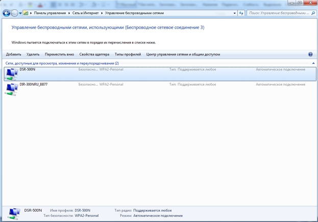 В списке выделить свою сеть и нажать кнопку Удалить. После удаления профиля желательно выключить и заново включить беспроводное соединение на компьютере. Это можно сделать с помощью комбинации: Fn + <соответствующая клавиша>, если у Вас ноутбук, или нажать кнопку Пуск и там перейти в Панель управления → Сеть и Интернет → Центр управления сетями и общим доступом → Изменения параметров адаптера.