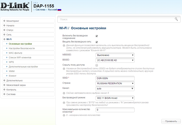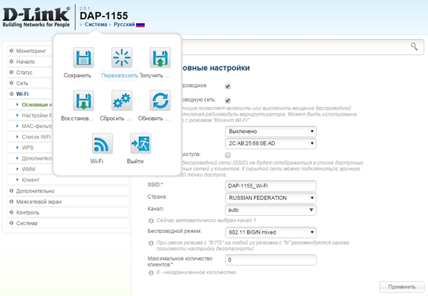 3. В поле SSID сменить наименование беспроводной сети, либо добавить хотя бы один символ (при вводе SSID можно использовать только латинские буквы и цифры). Чтобы зафиксировать изменения нажимаете кнопку Применить и затем Система → Сохранить, а после Система → Перезагрузить.