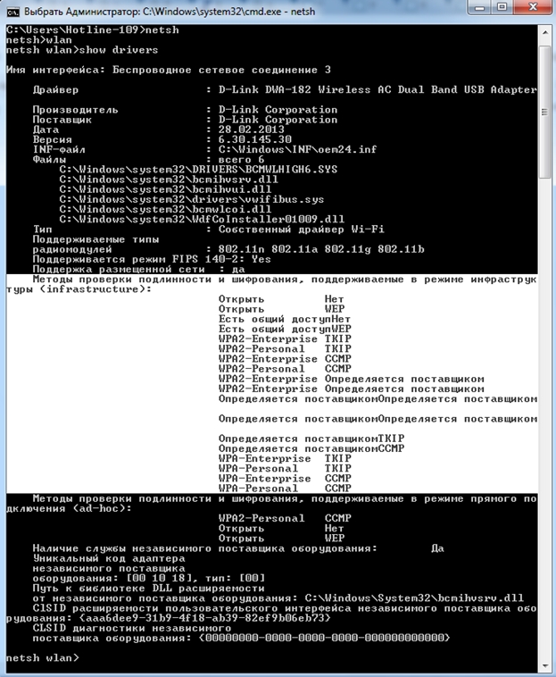 После ввода последней команды отобразится общая информация о драйвере. В представленной информации нужно найти раздел «Методы проверки подлинности и шифрования», где отображаются поддерживаемые типы аутентификации и шифрования Вашим беспроводным адаптером на компьютере.