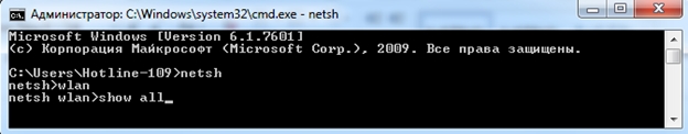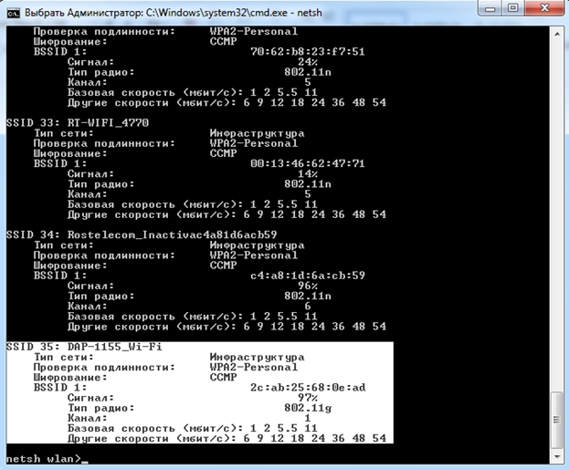 После ввода последней команды отобразится список Wi-Fi сетей, вещаемых в зоне видимости Вашего беспроводного адаптера. Среди этого списка находите свою Wi-Fi сеть и убеждаетесь, что выбраны правильные параметры в строках Проверка подлинности (Сетевая аутентификация) и Шифрование (Тип шифрования).