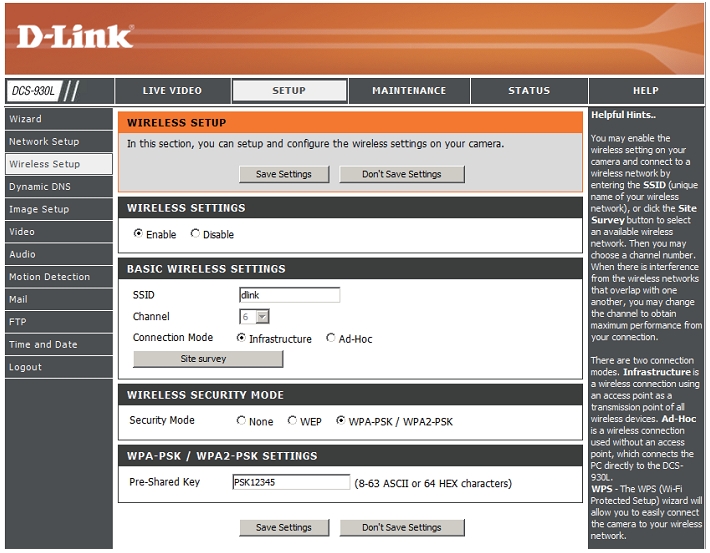 2. Выберите вкладку Setup —Wireless Setup