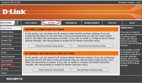 2. Перейдите на вкладку SETUP (вверху) а затем выберите раздел Event Setup (слева)