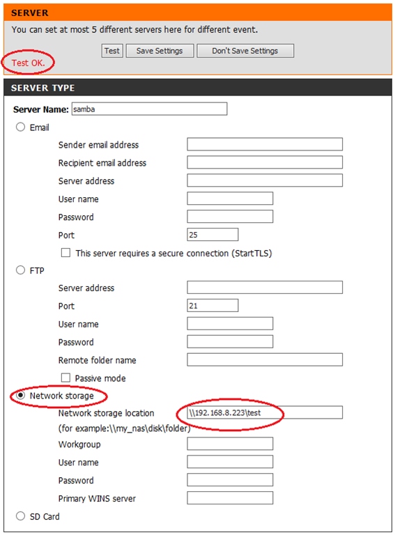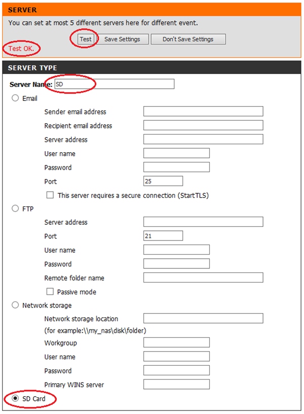 Для добавления в качестве сервера SD карты, установленной в камере, ставим точку напротив поля SD и вводим имя сервера – Server Name