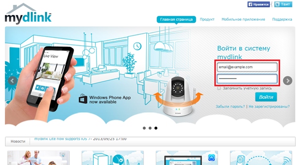 Шаг 2: Введите Ваши учетные данные mydlink (адрес email и пароль) в окне авторизации и нажмите Войти.