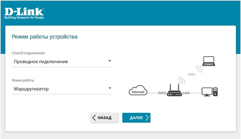 4. В списке Способ подключения выберите Проводное подключение, в качестве режима работы задайте Маршрутизатор и нажмите Далее.