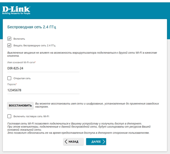 7. Аналогично выполняется настройка беспроводной сети для диапазона 5 ГГц. Для перехода к следующему шагу настройки нажмите Далее.