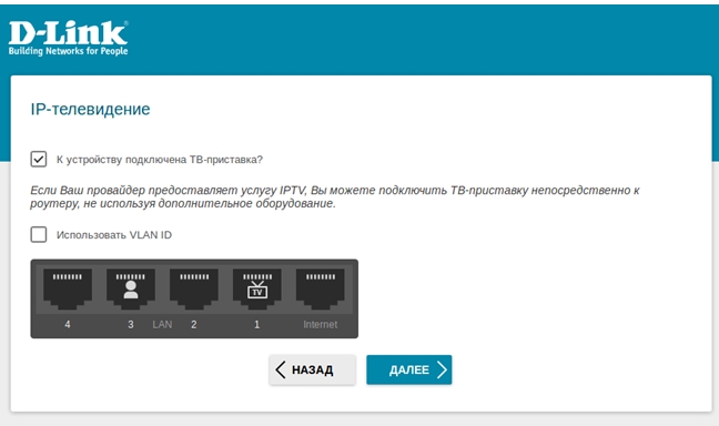8. Если к маршрутизатору подключена ТВ-приставка, установите флажок в соответствующее поле и выберите порт маршрутизатора, к которому она подключена (на примере выбран порт № 1).