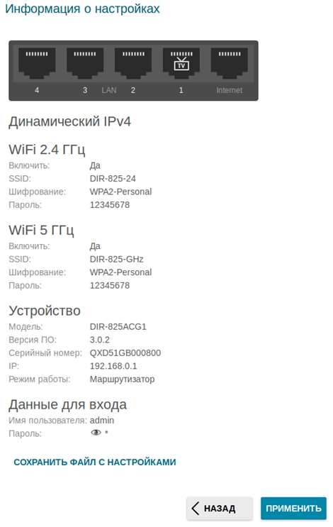 11. На следующей странице должно появиться окно с информацией о выполненных настройках. Вы можете сохранить данные настройки в текстовый документ, нажав для этого кнопку Сохранить файл с настройками.