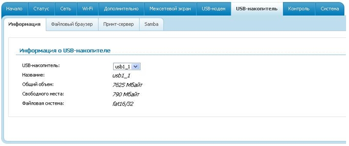 1.      Подключите USB-накопитель в USB-порт модема и убедитесь, что USB-накопитель успешно  определился маршрутизатором. Раздел «USB-накопитель/Информация» ( рис .1)