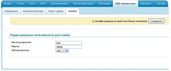 2.      Создайте учётную запись пользователя в разделе «USB-накопитель/Samba»