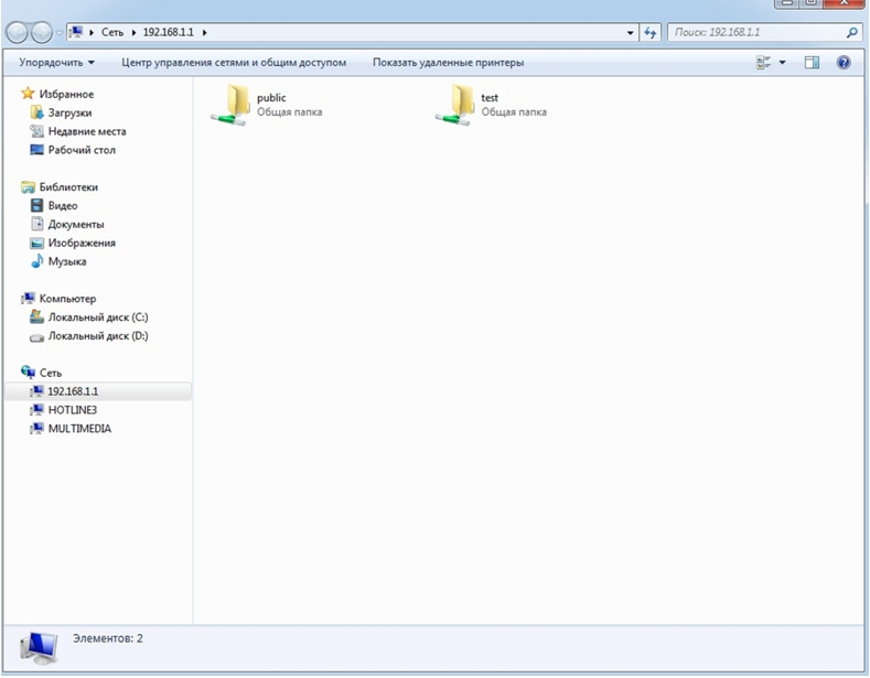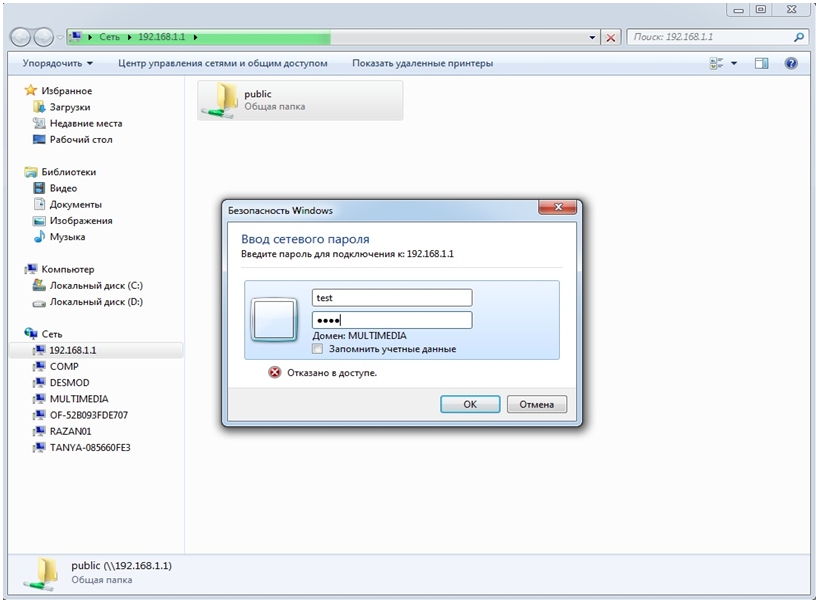 3.      Для доступа к USB-накопителю обратитесь по SMB протоколу: 192.168.1.1 . Вы увидите каталог Public, для входа в который используйте логин/пароль пользователя (в данном примере используется логин/паротль test/test) (рис.3)