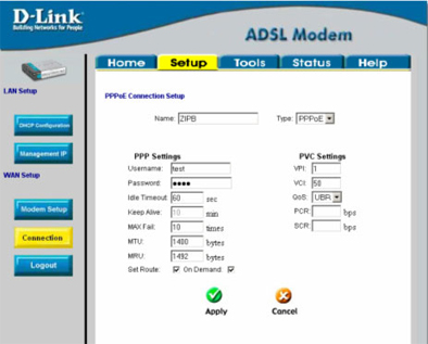 - Настраиваем PPPoE соединение (вместо параметров username, password, VPI, VCI нужно ввести значения, полученные от провайдера)
