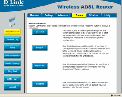Для сохранения настроек выберите закладку Tools ->System Commands ->Save All ->Back, после чего нажмите кнопку Restart.