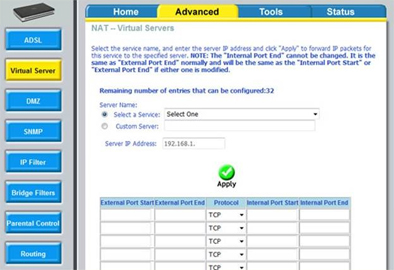 Для создания правила Virtual Server перейдите на страницу Advanced > Virtual Server.