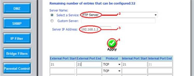 Все запросы на соединение, приходящие на 21 порт со стороны WAN интерфейса, будут транслироваться на 21-й порт хоста в локальной сети с адресом 192.168.1.2