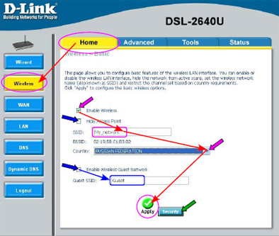 Ставим или оставляем «галочку» «Enable Wireless» для включения радиотракта. Если требуется отключить широковещание имени сети SSID (с целью простейшей защиты сети), то ставим «галочку» «Hide Access Point». Вводим имя своей Wi-Fi сети, например «My_network». Выбираем страну места эксплуатации, для России это «RUSSIAN FEDERATION». Если необходима дополнительная гостевая Wi-Fi сеть, то ставим «галочку» «Enable Wireless Guest Network» и вводим имя гостевой Wi-Fi сети, например «Guest». После внесения всех изменений нажимаем для сохранения параметров кнопку «Apply».
