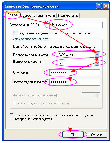 Нажимаем кнопку «Добавить», в открывшемся окне вводим параметры нашей Wi-Fi сети: «Сетевое имя (SSID):» - «My_network», «Проверка подлинности:» - «WPA2-PSK», «Шифрование данных:» - «AES», «Ключ сети:» и «Подтверждение ключа:» - ключ, указанный в маршрутизаторе в настройках «Security», и для сохранения нажимаем кнопку «ОК».