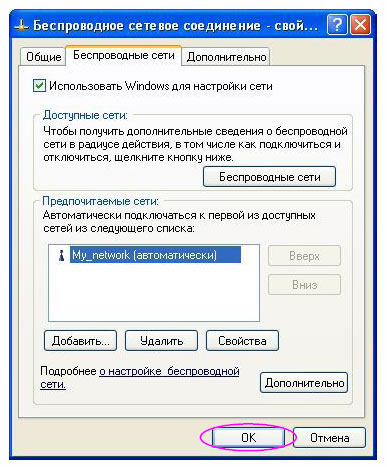 Далее в окне «Беспроводное сетевое соединение – свойства» также для сохранения параметров нажимаем кнопку «ОК», после чего происходит подключение к беспроводной сети.