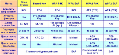 Примечание. Сравнительная таблица методов аутентификации и шифрования приведена ниже. Наиболее стойкую защиту беспроводного канала даёт совместная работа точки доступа и RADIUS сервера (для аутентификации беспроводных клиентов). Это режимы «WPA-2 EAP» и «WPA EAP». При отсутствии возможности установки RADIUS сервера (домашние сети и сети малого офиса), используются режимы «WPA-2 PSK» и «WPA PSK». Менее всех защищён режим «WEP» («Shared Key»). При отсутствии необходимости защиты беспроводной сети (например, общедоступный Hot Spot), используется режим открытого доступа без шифрования «Open System».