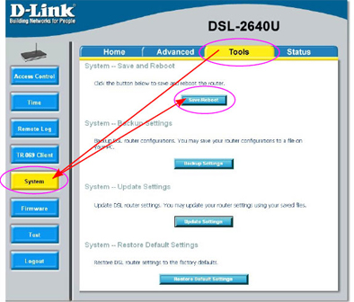 После перезагрузки точки доступа маршрутизатора для сохранения внесённых изменений выбираем вкладку «Tools» и страницу «System». После нажимаем кнопку «Save/Reboot».