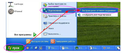 Откроем окно выбора беспроводных сетей. Для этого можно нажать меню «ПУСК», далее «Подключение», и далее «Беспроводное сетевое соединение»: