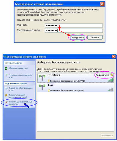 Так как в нашем случае для доступа к беспроводной сети требуется установка ключа, то Windows запросит ввод ключа. Вводим в окна «Ключ сети» и «Подтверждение ключа» ключ, указанный в маршрутизаторе в настройках «Security», и нажимаем кнопку «Подключить». После чего Windows создаст автоматический профиль Wi-Fi сети и подключится к ней.