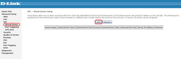 Для создания правила Virtual Servers в разделе “Advanced Setup” выберите подраздел “NAT”, а в нем пункт “Virtual Servers”.