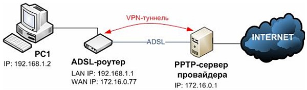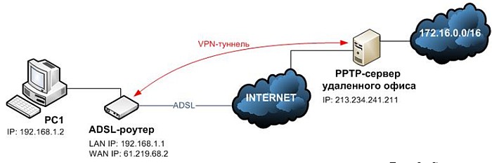Задача. В удаленном офисе есть локальная сеть, для доступа к её ресурсам необходимо создать VPN-туннель между ADSL-роутером и PPTP-сервером офиса (см. рис.2).
