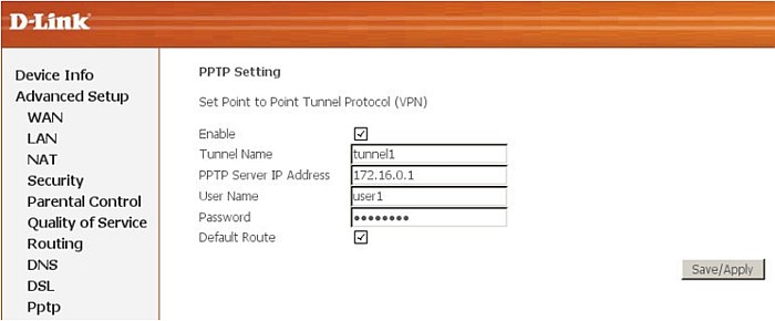 Default Route: включение данной опции назначает PPTP-соединение шлюзом по умолчанию, отключение данной опции позволяет указать адрес сети, запросы к которой будут проходить через PPTP-туннель.