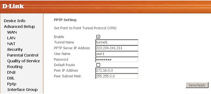 Зайдите в раздел «Advanced Setup->PPTP».