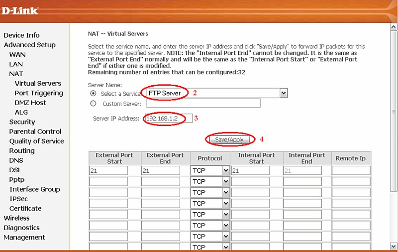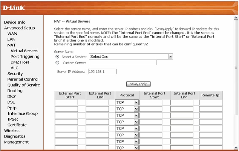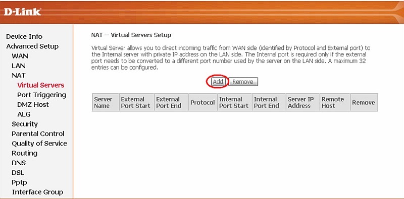 Для создания правила перейдите на страницу Advanced Setup > NAT> Virtual Servers.