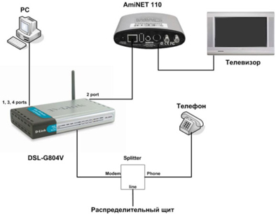 Подключите сплиттер, DSL-G804V, Set-Top-Box, телевизор и телефон как показано на рис.1.