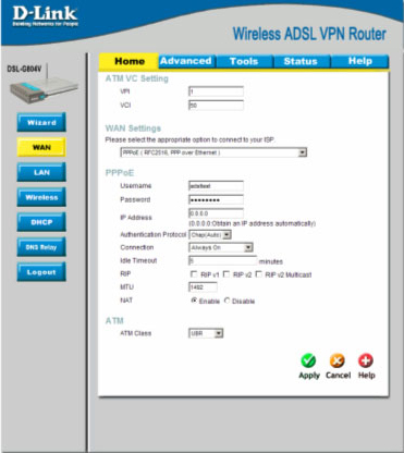 | WAN Settings | PPPoE (RFC 2516, PPP over Ethernet) |