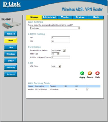 2. Нажмите на кнопку WAN в столбце под изображением DSL-G804V. В самом низу нажмите на иконку напротив интерфейса wanlink в таблице WAN Services Table. В появившемся окне (см. рис. 3) выставите следующие значения:
