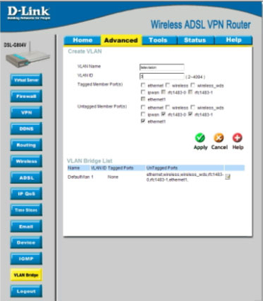 Замечание: данная настройка выделяет порт встроенного в DSL-G804V коммутатора для телевизионной приставки. В рассматриваемом примере используется второй порт.