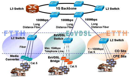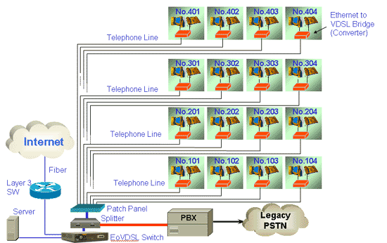 Устройства EoVDSL позволяют преобразовывать сигнал между стандартным Ethernet и VDSL-технологией и предоставляют сервис сетей Ethernet на большие расстояния, используя в качестве транспорта технологию VDSL. Ethernet-over-VDSL (EoVDSL) - это симметричная технология, обеспечивающая максимальную скорость до 15 Мбит/с и расстояние до 1500 м по существующей проводке категорий 1, 2 и 3. Таким образом, данное решение позволяет существенно сократить расходы по развертыванию сети и прокладке новых оптоволоконных линий.