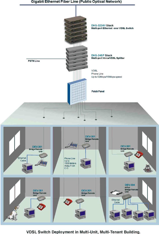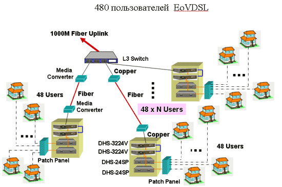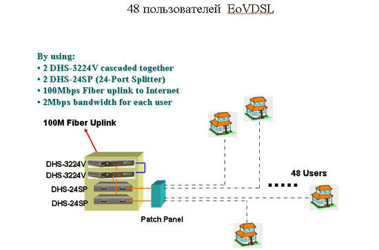 D-Link предлагает законченное решение по построению сети EoVDSL - сюда входят модемы DEV-301 и DEV-304, коммутатор DHS-3224V и сплиттер DHS-24SP. Такие решения очень популярны для студенческих городков, для коттеджных поселков, для гостиниц или даже многоквартирных домов. Общие схемы построения подобных сетей вы можете увидеть ниже.