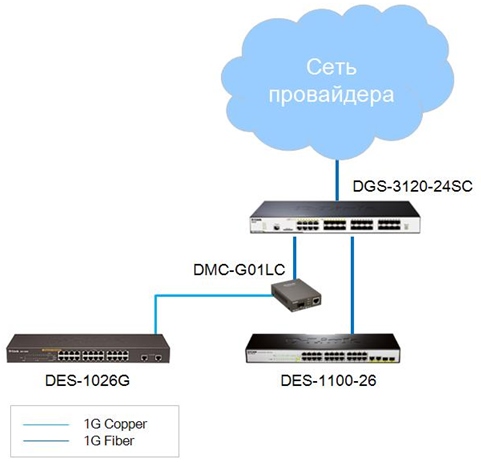 Рассмотрим пример построения доступа на базе двух коммутаторов D-Link DES-1026G и DES-1100-26, подключенных по оптике к коммутатору DGS-3120-24SC, который выступает в роли коммутатора уровня агрегации: