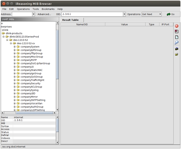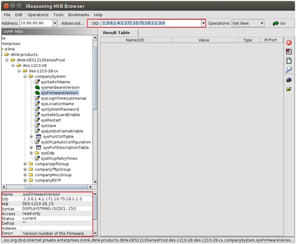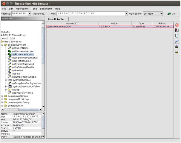 Например, получим по SNMP версию программного обеспечения коммутатора DES-1210-28. Для этого найдём в MIB дереве ветвь Compan, а в ней sysFirmwareVersion. Далее в поле Address требуется ввести ip адрес коммутатора, нажать кнопку Operations →Get и в поле Result Table отобразится запрашиваемый параметр.