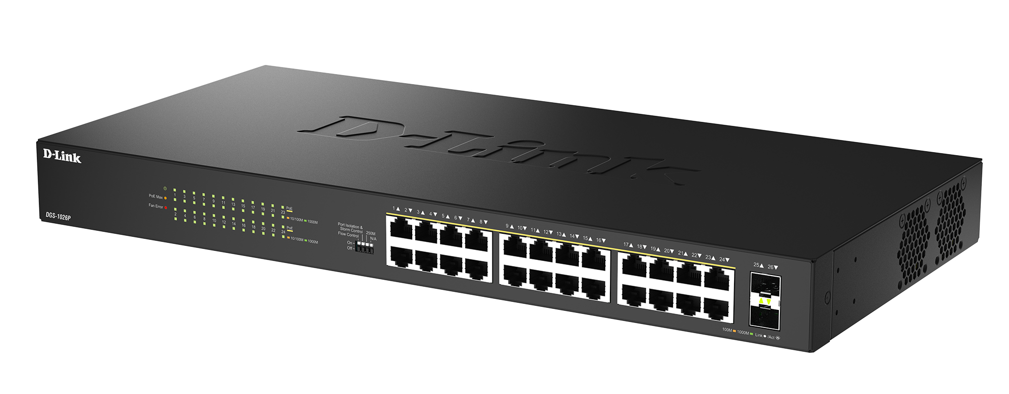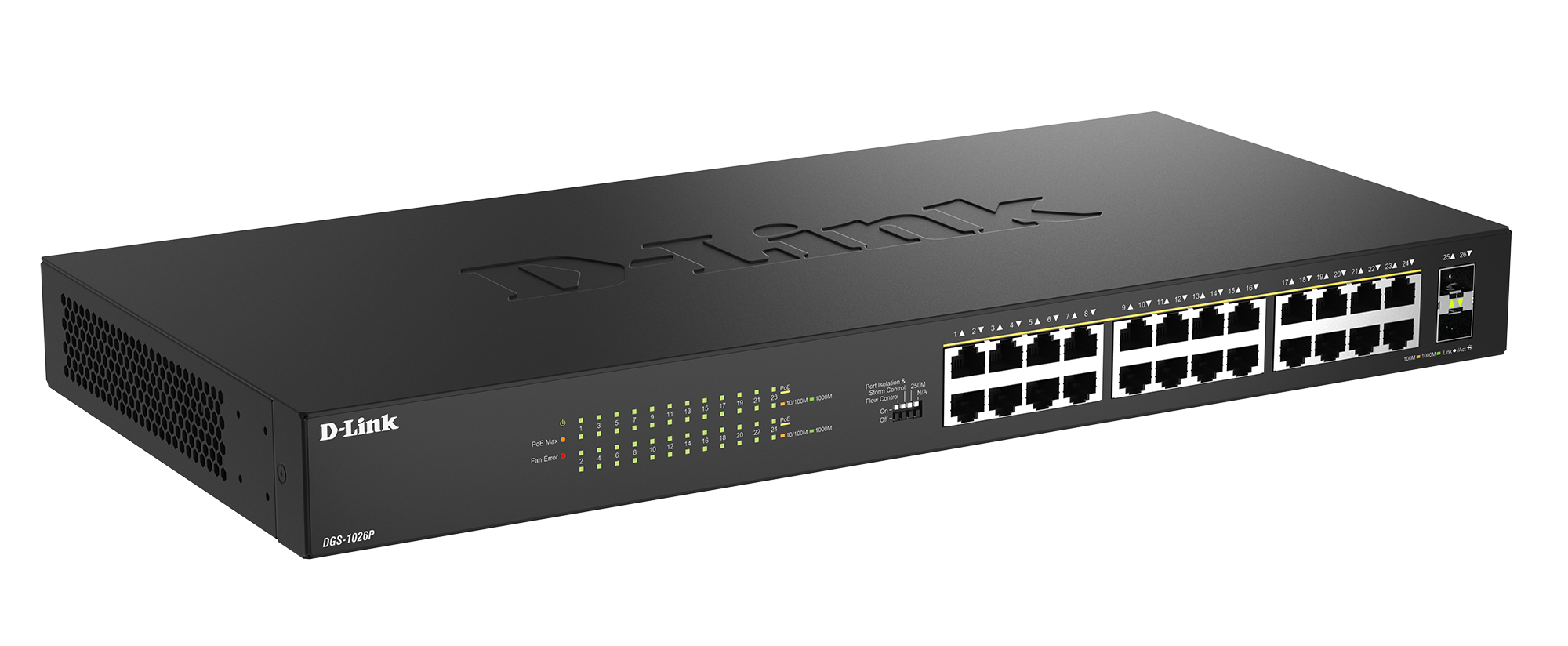 Коммутатор DGS-1026P оснащен 24 портами 10/100/1000Base-T с поддержкой PoE, 2 портами 1000Base-X SFP и DIP-переключателем с возможностью конфигурирования. Коммутатор рекомендуется для использования в сетях SOHO и предприятий малого и среднего бизнеса (SMB). Поддержка PoE позволяет пользователям легко подключать и подавать питание по Ethernet-кабелям на такие устройства, как PoE-совместимые беспроводные точки доступа, сетевые камеры или IP-телефоны.