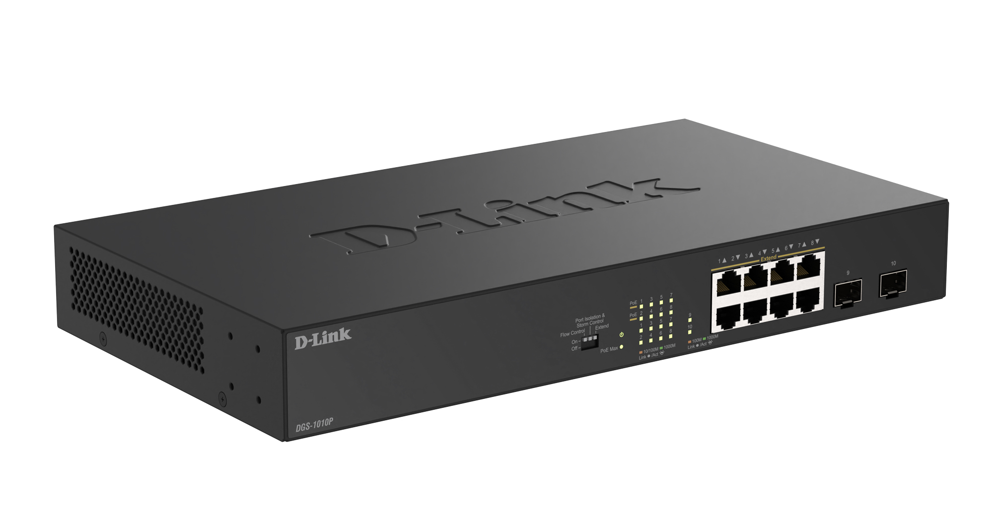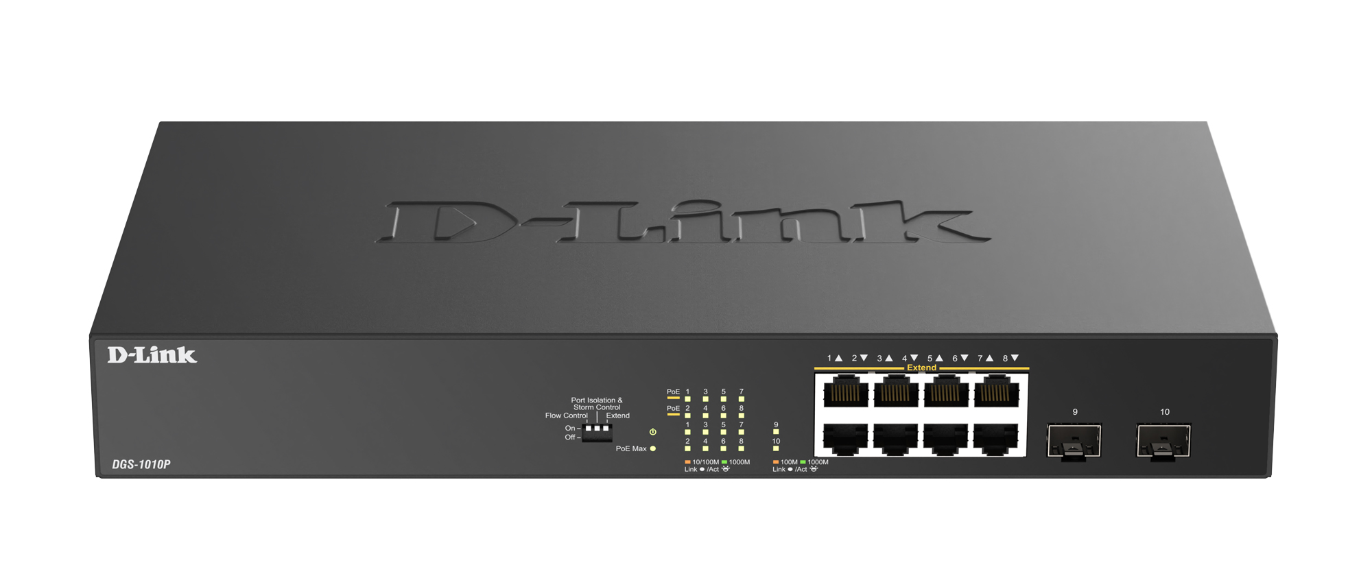 Коммутатор DGS-1010P оснащен 8 портами 10/100/1000Base-T с поддержкой PoE, 2 портами 1000Base-X SFP и DIP-переключателем с возможностью конфигурирования. Коммутатор рекомендуется для использования в сетях SOHO и предприятий малого и среднего бизнеса (SMB). Поддержка PoE позволяет пользователям легко подключать и подавать питание по Ethernet-кабелям на такие устройства, как PoE-совместимые беспроводные точки доступа, сетевые камеры или IP-телефоны.