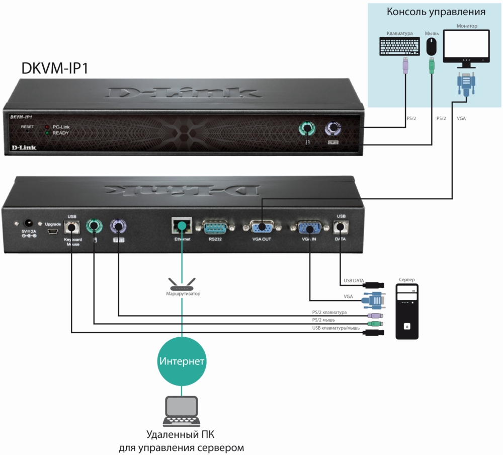 Переключатель DKVM-IP1 позволяет удаленно управлять компьютером/сервером через сеть Интернет. Устройство также может быть подключено к стандартному KVM-переключателю для удаленного управления несколькими компьютерами.